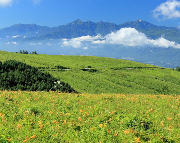 美ヶ原高原は主峰王ヶ頭(2034m)を中心に北に武石峰、南に茶臼山、東に物見石山、西に王ヶ鼻(2008m)のいずれも標高2000m近い熔岩台地で約1千ヘクタールの大草原に200種類を超える亜高山植物が咲き競い、遠く富士山をはじめ、北アルプス、中央アルプス、南アルプス、八ヶ岳の雄大な360度のパノラマが壮麗な景観を展開するその名に相応しい高原です。